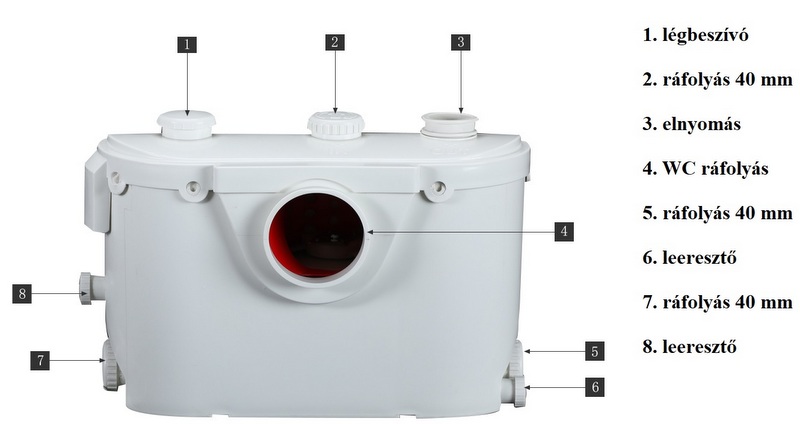 • WC,  + 2 alsó (zuhany) és egy felső (mosdó, mosógép) rákötési lehetőség